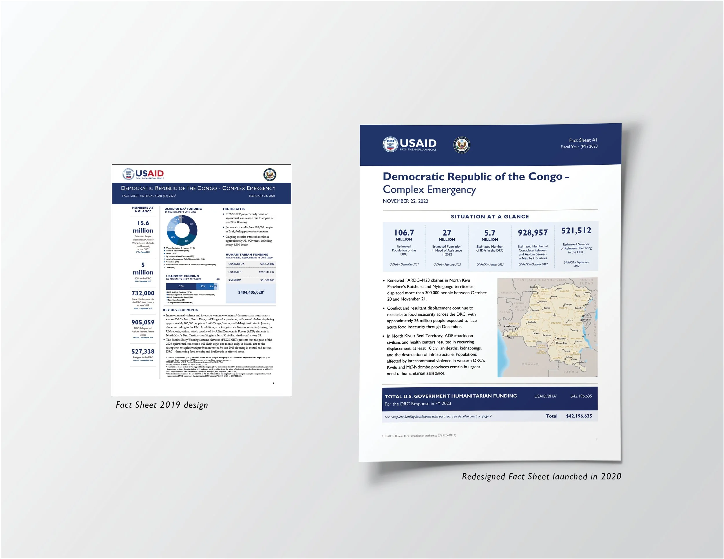 Worked with an internal USAID/BHA client over several weeks to develop a new Fact Sheet template. Before the redesign, the client conducted a stakeholder analysis of the existing Fact Sheet to gain information shifting content needs, including both written and visual content. I then utilized this stakeholder analysis, in collaboration with the client's requirements, to design a new Fact Sheet template that is not only flexible but also adaptable, ensuring it can accommodate the wide variety of content needs.